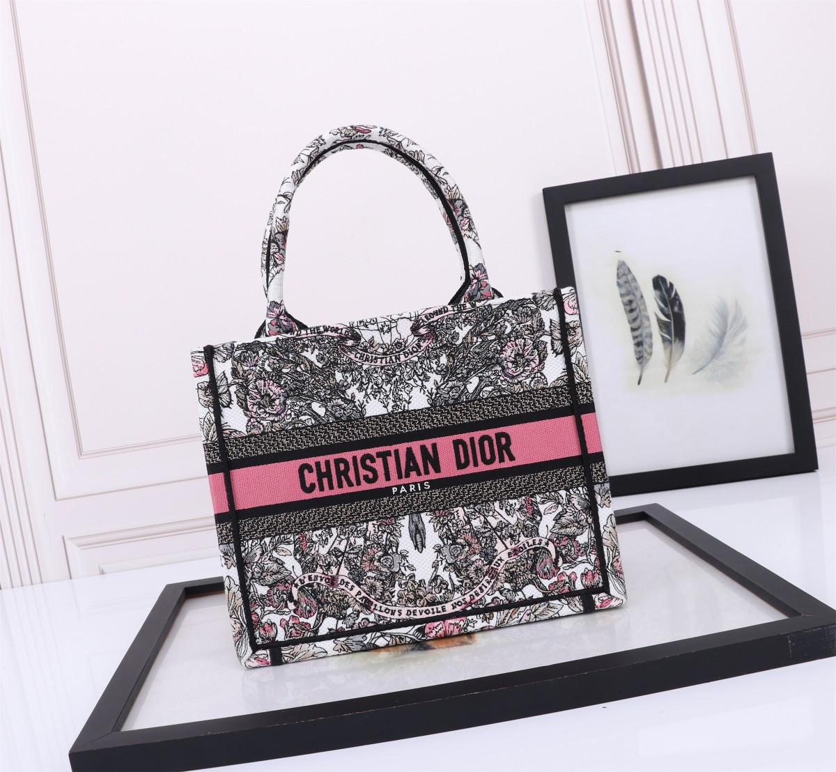 small D*or book tote white and pastel pink butterfly around the world embroidery 10.5 x 8.5 x 5.5 inches
